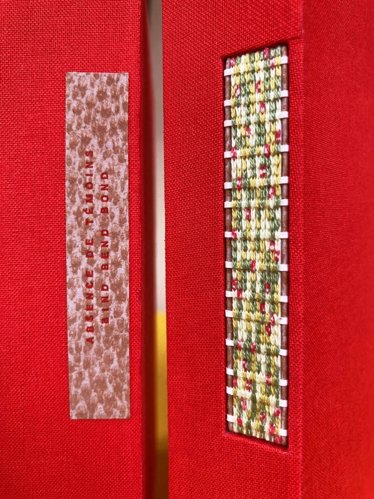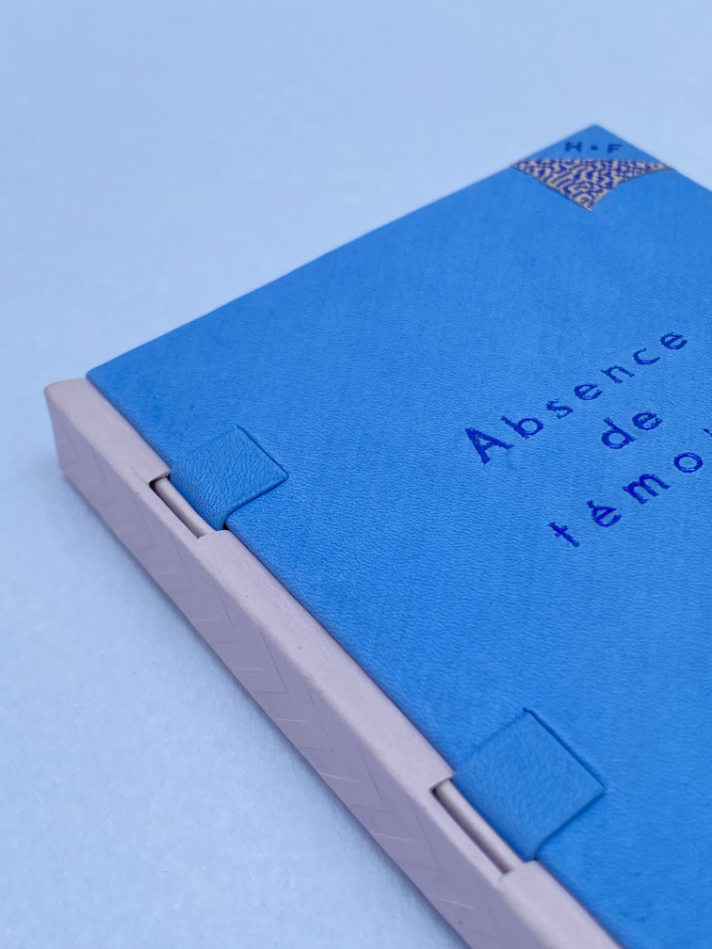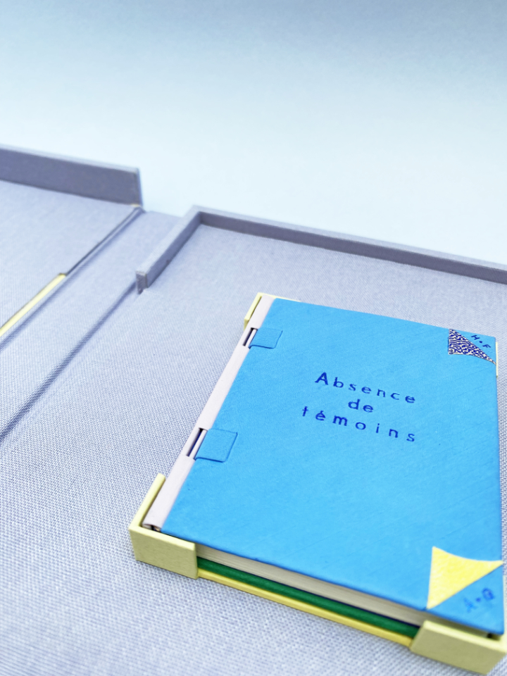 [Juliette] J’ai décidé de relier l’édition « Absence de Témoins » conçue par 4 membres de notre collective spécialement dans le cadre de ce projet. Cela a été l’opportunité pour moi de participer au processus créatif commun après écriture en y ajoutant une seconde lecture via la forme et la matière.