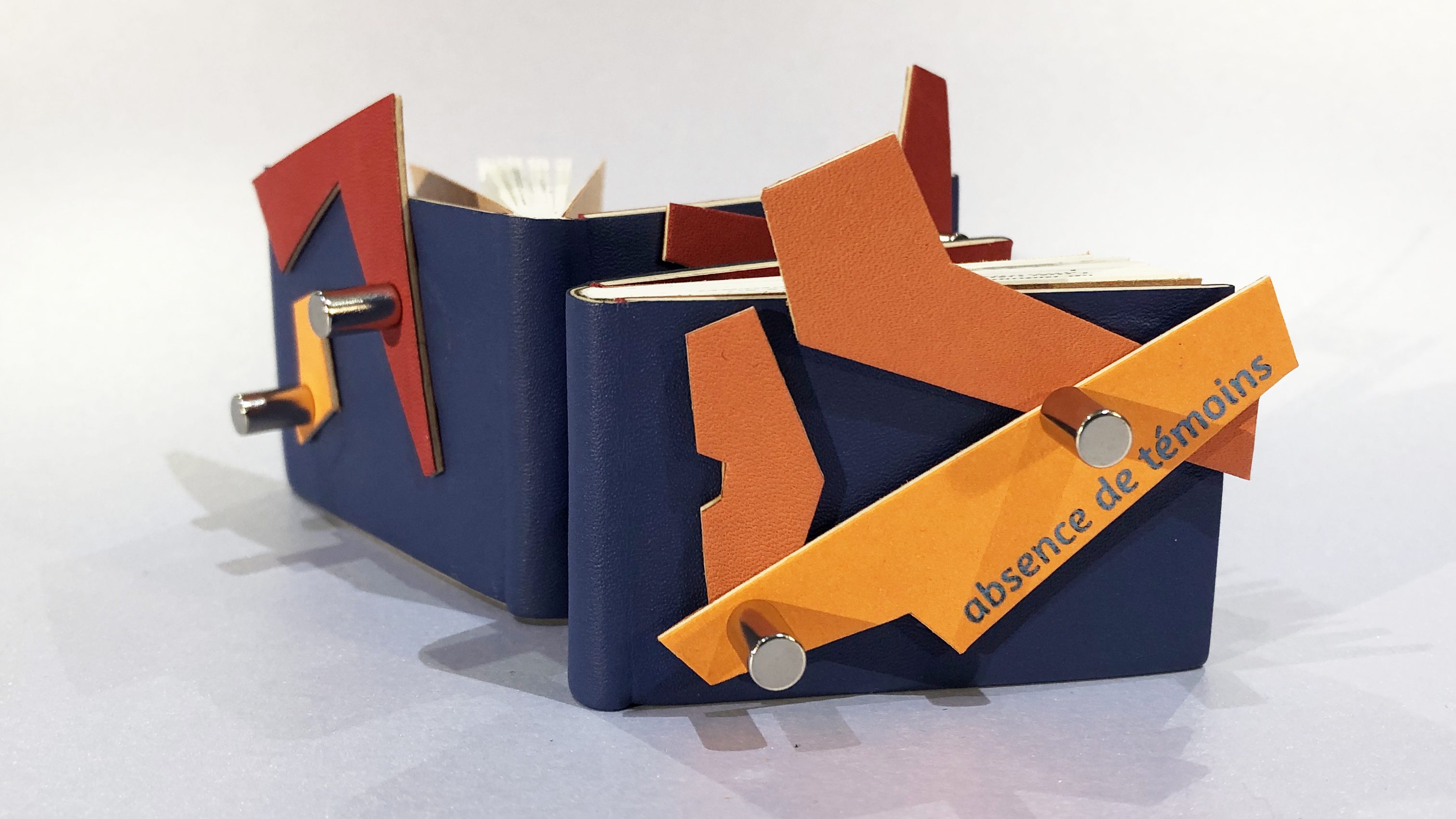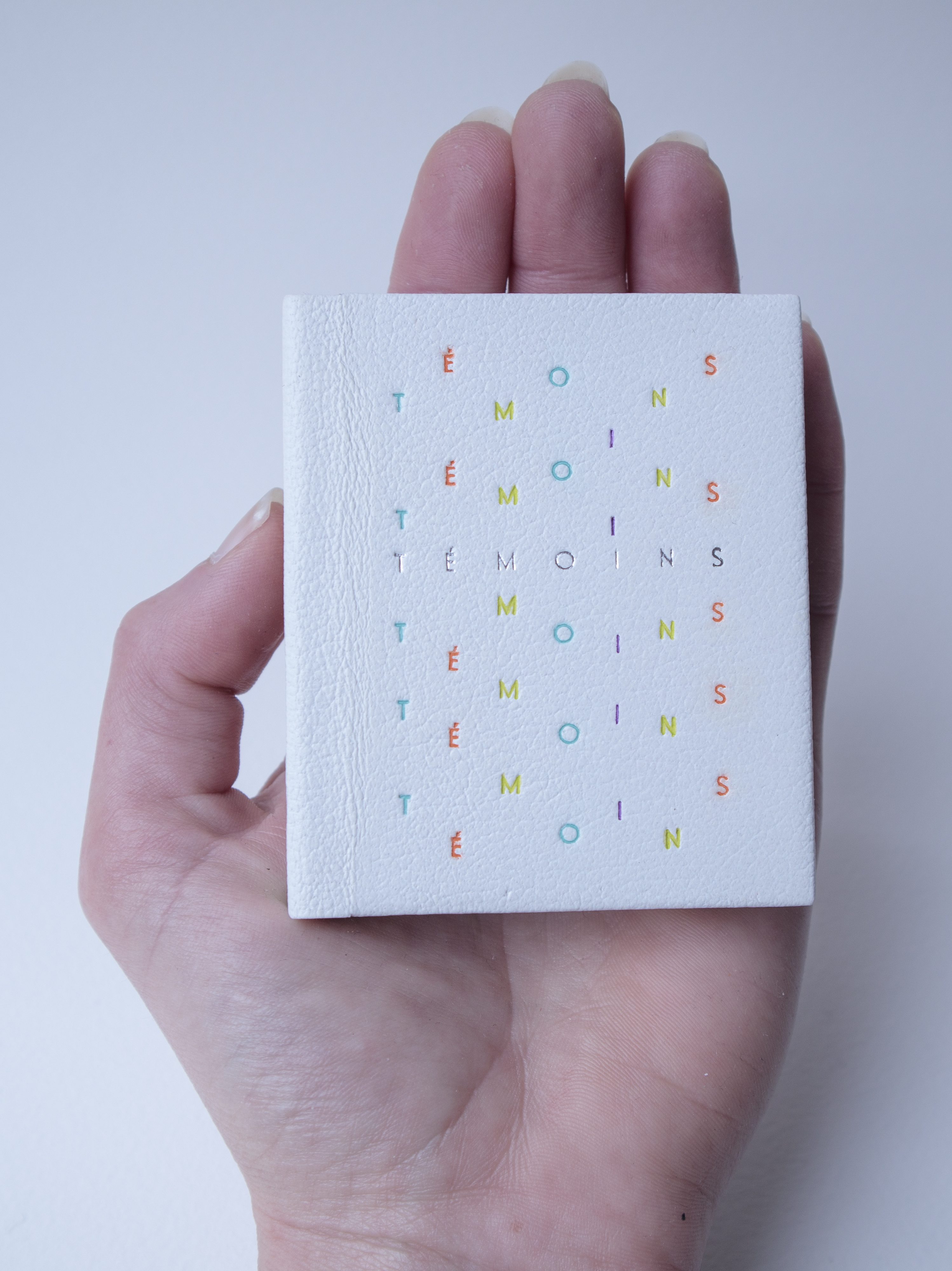 La conception du texte – Absence de témoins – inspire Paula qui utilise un procédé semblable au processus de création du texte pour mettre au point sa reliure. Quand le texte naît de quelques mots choisis au hasard qui s’agglomèrent pour devenir un texte, la reliure naît, elle, de quelques chutes de cuir qui s’étofferont pour devenir une reliure.