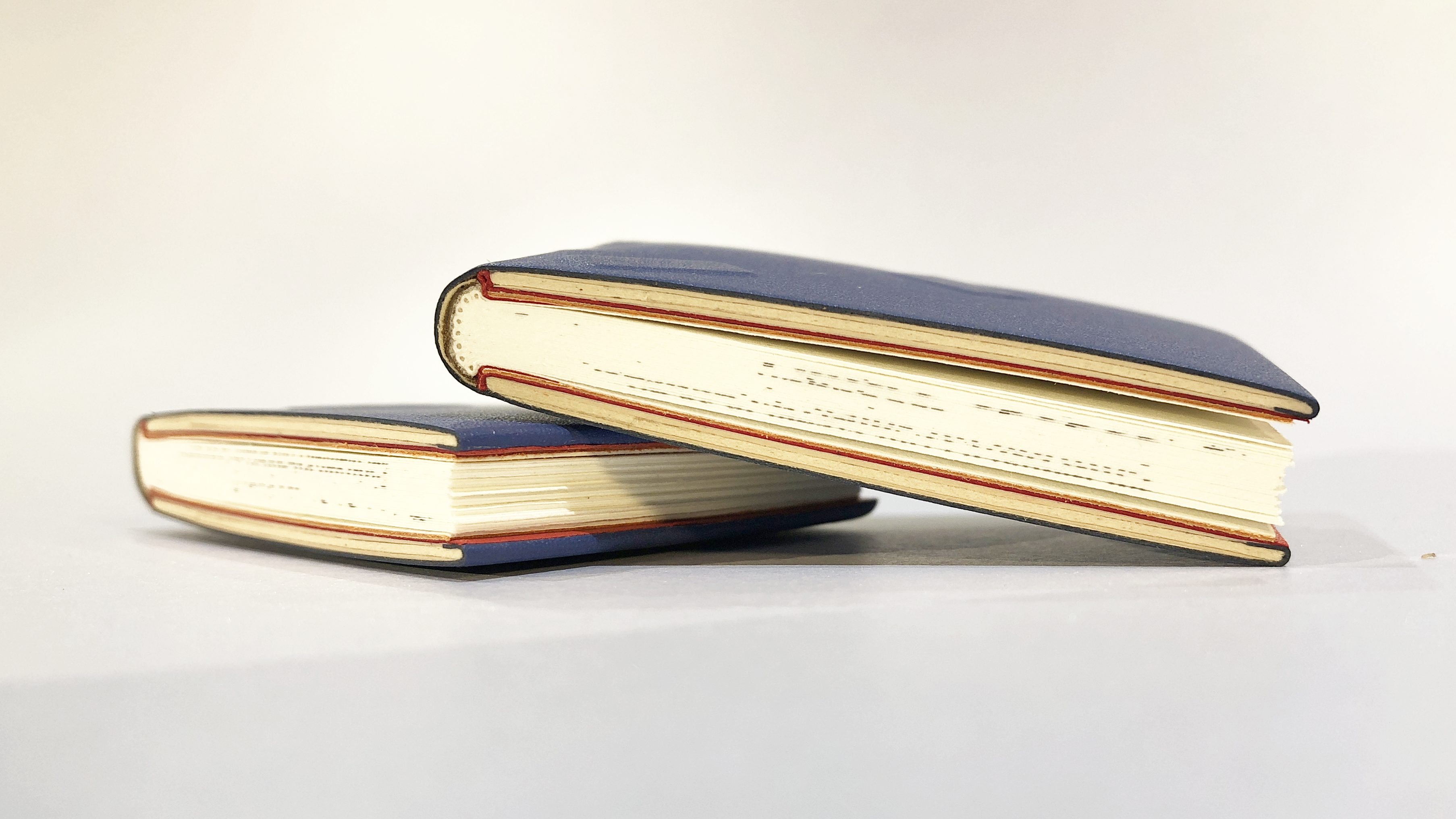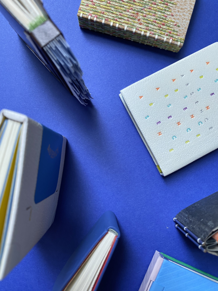 À l’occasion de l’exposition Petites Merveilles qui au lieu entre le 1er et le 30 novembre 2025 au Musée des Métiers d’Art du Québec (MUMAQ), nous avons créé une collection de reliures d’art. Ces reliures sont des miniatures, n’excédant pas 8 centimètres ni en hauteur, ni en largeur et ni en profondeur.