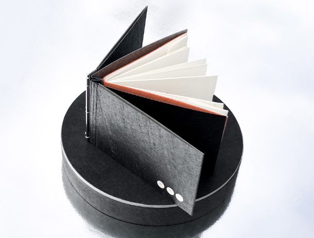 La dimension artistique est apportée par des éléments de décor fixés sur la couverture avec des aimants. Grâce à ces mosaïques mobiles, la composition est interchangeable. Il y a également une volonté de repenser sa manière de travailler en réduisant son impact environnemental. L’intégralité de la reliure a été réalisée sans colle plastique et les matériaux proviennent uniquement des chutes de l’atelier.