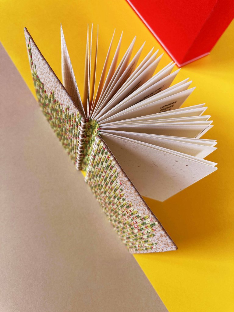 [Angeline] Oui. Cette structure, que je continue d’explorer et d’affiner selon mes reliures, m’a ici techniquement permis de rester dans la continuité du contenu du livre. Je l’ai utilisée comme un terrain de jeu à l’image de la conception éditoriale de cet ouvrage qui s’est faite dans une atmosphère joyeuse et ludique.