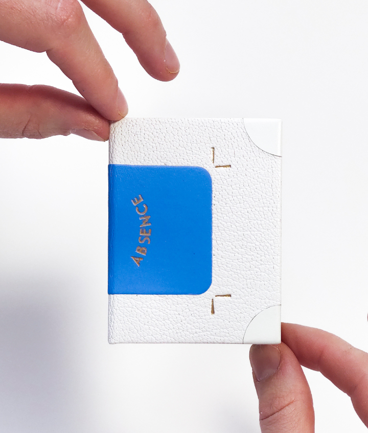 [Juliette] Il s’agit d’un clin d’œil au nom de l’exposition et à la contrainte de taille imposée du projet (maximum 8x8x8cm). J’ai souhaité créer un jeu d’échelle entre la boîte et la couverture afin de donner l’illusion de rétrécir encore plus le format réel de la reliure.