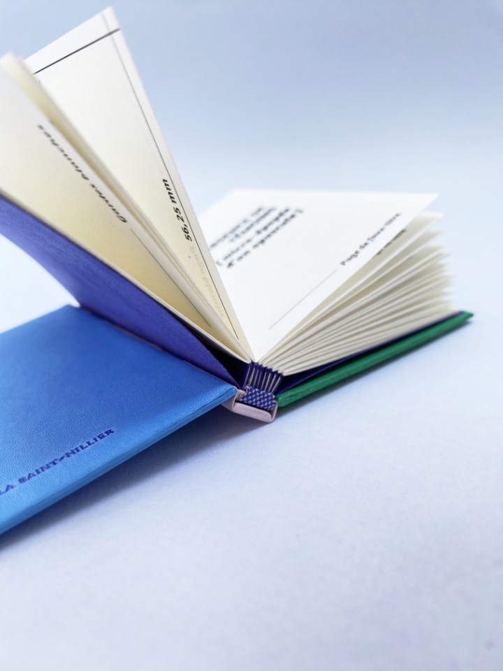 [Camille] Je ne voulais pas partir sur une structure traditionnelle en cuir. J’ai opté pour une structure légère, la stick binding, développée par Suzanne Schmollgruber et Edwin Heim.